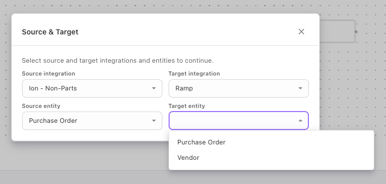 Estas sincronizaciones dependientes aparecen como filas adicionales debajo de la sincronización principal en el lienzo. Si tu sincronización tiene dependencias obligatorias, debes configurar tu integración para obtener esos tipos de entidad junto con la entidad principal que deseas sincronizar (p. ej., debes obtener tanto Órdenes de compra como Proveedores/ Vendedores en la misma integración para los sistemas de Origen y Destino). Las subentidades, como las Líneas de orden de compra, se obtienen automáticamente junto con su entidad principal; no necesitas hacer ninguna configuración especial para habilitar esto.
