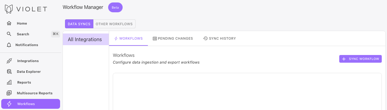 Ve a la pestaña **Flujos de trabajo** y haz clic en <mark style="color:$primary;">**+ Flujo de trabajo de sincronización**</mark>.