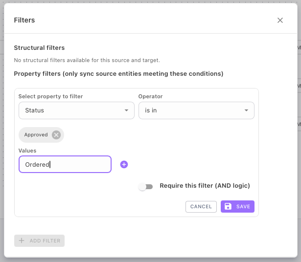 * **Filtros** — condiciones opcionales que limitan qué registros de origen se sincronizan (p. ej., sincronizar solo piezas con Estado = "Liberado")