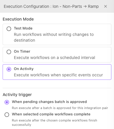 Puedes elegir ejecutar los cambios de sincronización con un **temporizador**, o **al actividad**. Si deseas ejecutar los cambios de sincronización **al actividad**, puedes elegir entre una *aprobación* *manual*, o *ejecución automática* cada vez que finaliza el flujo de trabajo de creación de cambios de sincronización.
