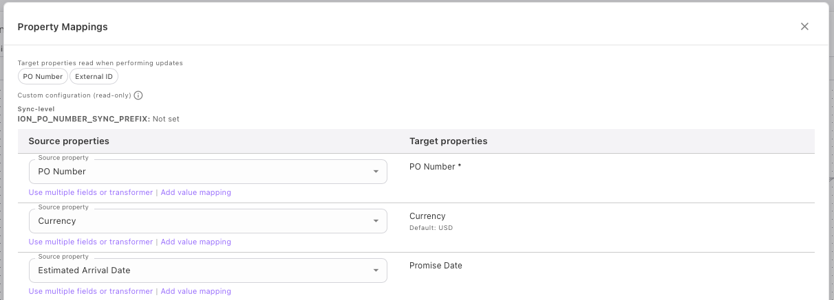 * **Destino** — el sistema y el tipo de registro que estás sincronizando *a* (p. ej., ION – Revisión de pieza)